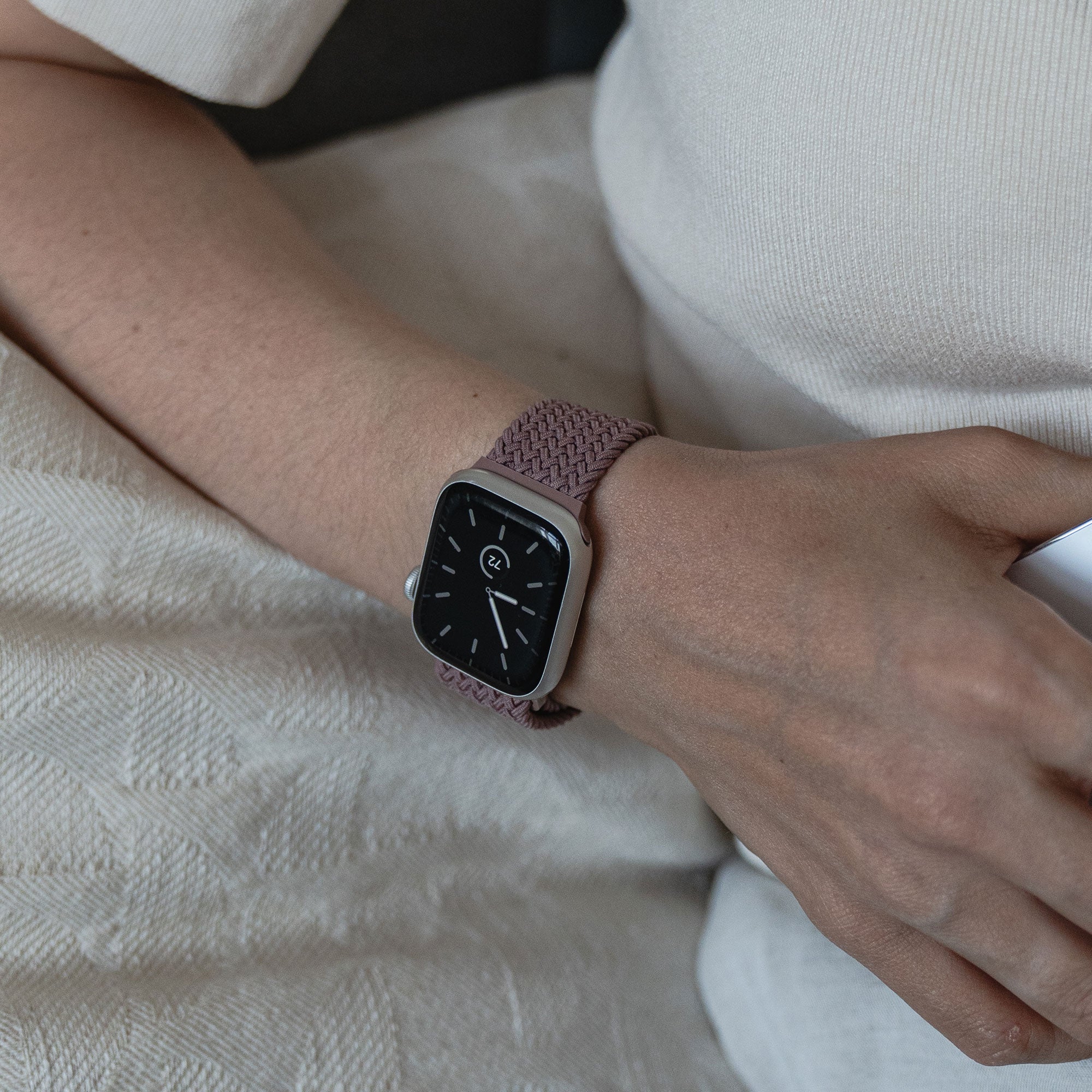 • Person, die ein von Arktisband geflochtenes Apple Watch Armband „Casual“ mit Magnetverschluss in Pink trägt, eine weiße Schachtel hält und auf einem cremefarbenen Kissen ruht.