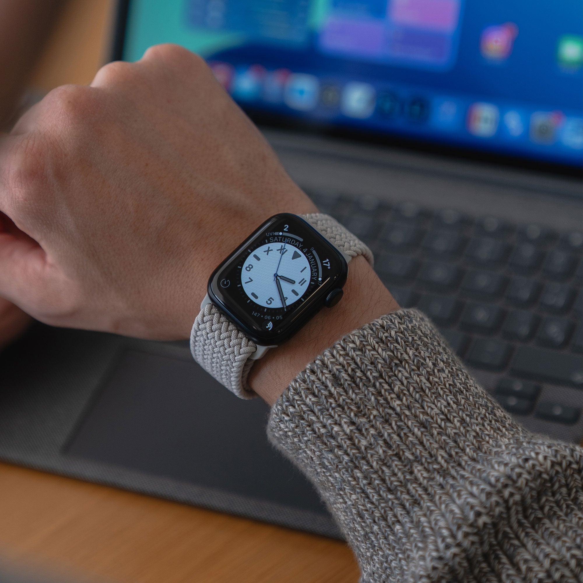 • Eine Person, die eine cremefarbene Jacke und ein geflochtenes Apple Watch Armband „Casual“ mit Magnetverschluss trägt, legt ihren Arm neben einem Stift und einem Teil eines Laptops auf einen Holztisch.